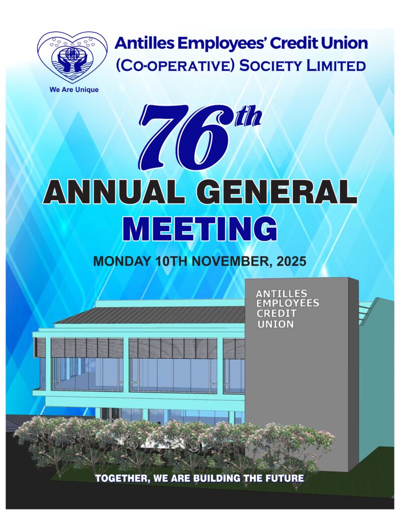Antilles Employees' Credit Union 76TH ANNUAL GENERAL MEETING 76TH ANNUAL GENERAL MEETING will be held at Vessigny Secondary School on November 10, 2025, commencing at 5:00 p.m.Registration begins at 3:30 p.m. AGM Brochure